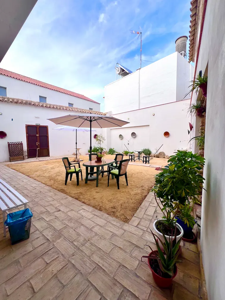 El Patio Principal: Nuestro patio más grande es el corazón social de la casa. Aquí, entre macetas de geranios encontrará cómodas mesas y sillas donde podrá disfrutar de un café por la mañana, planificar su día o degustar un aperitivo por la tarde. Es el lugar perfecto para sentir la brisa y observar el cielo azul.